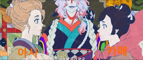 금남의 구역인 오오쿠에서 일어나는 여성들의 욕망에 대한 서사임에도 페미스럽지 않은 것이 매력인데요. 특히 극장판의 오리지널 캐릭터인 아사와 카메 두 캐릭터는 서로 상반되는 캐릭터는 흑과 백인 아닌 붉은색과 파란색의 케미를 보여줍니다.