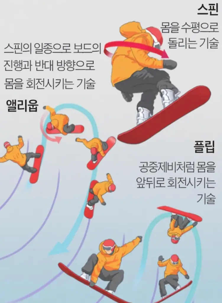 - 앨리웁 (Alley-Oop): 하프파이프에서 벽을 타고 올라가는 방향과 반대 방향으로 회전하는 기술로, 일반적인 회전보다 난도가 높습니다.